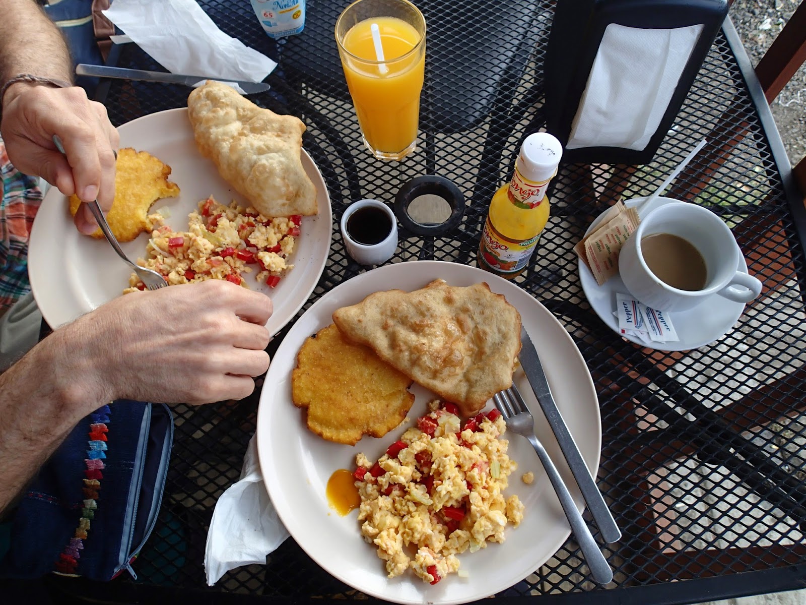 Breakfast Panama Style: eggs and various kinds of fried white carbs, great coffee and extra sugary juice. Good hot sauce.